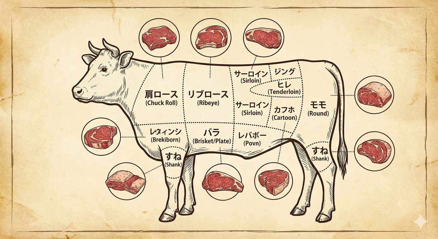 焼肉屋、鉄板焼き屋・肉バルでメニューにある牛肉の部位を表示しています。こちらで確認してから注文してみてはいかがでしょうか