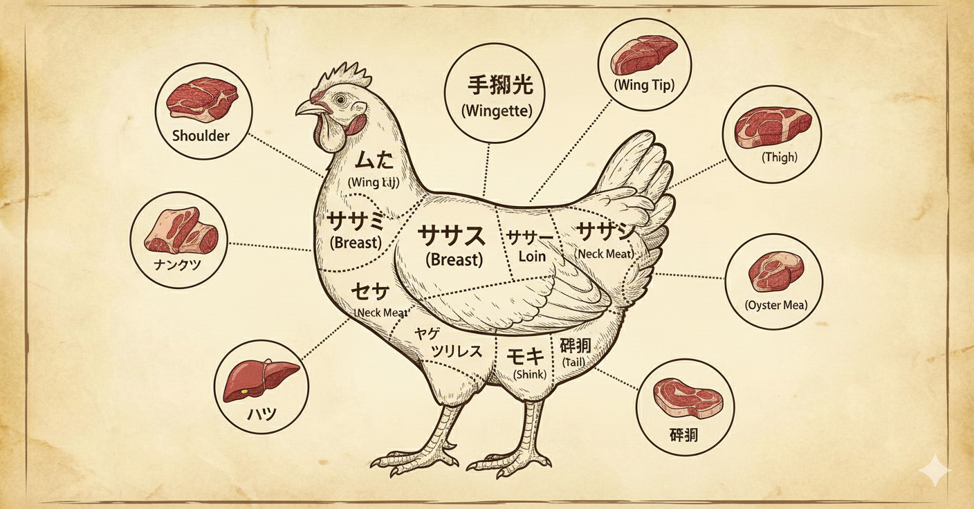 やきとり屋でメニューにある鶏肉の部位を表示しています。こちらで確認してから注文してみてはいかがでしょうか