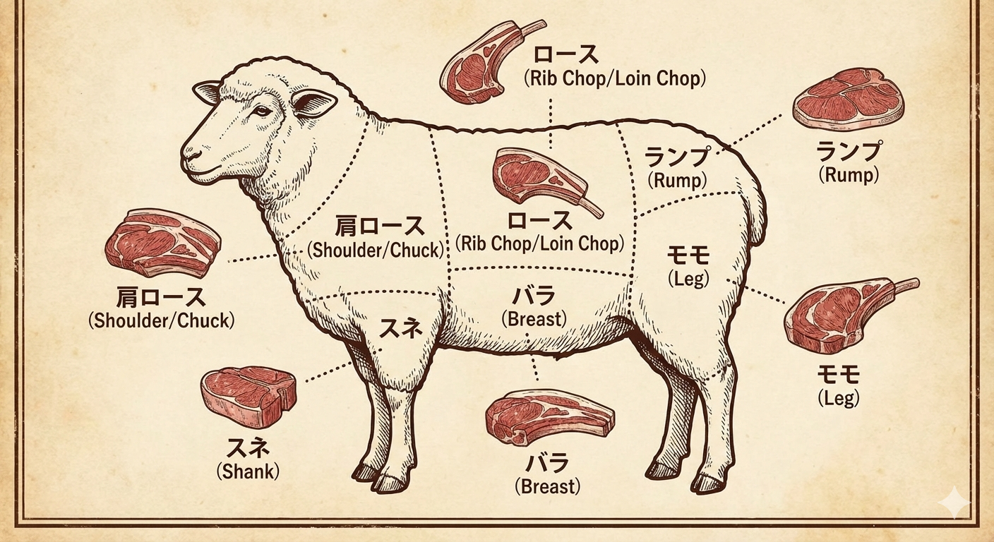 ジンギスカンでメニューにある羊肉の部位を表示しています。こちらで確認してから注文してみてはいかがでしょうか